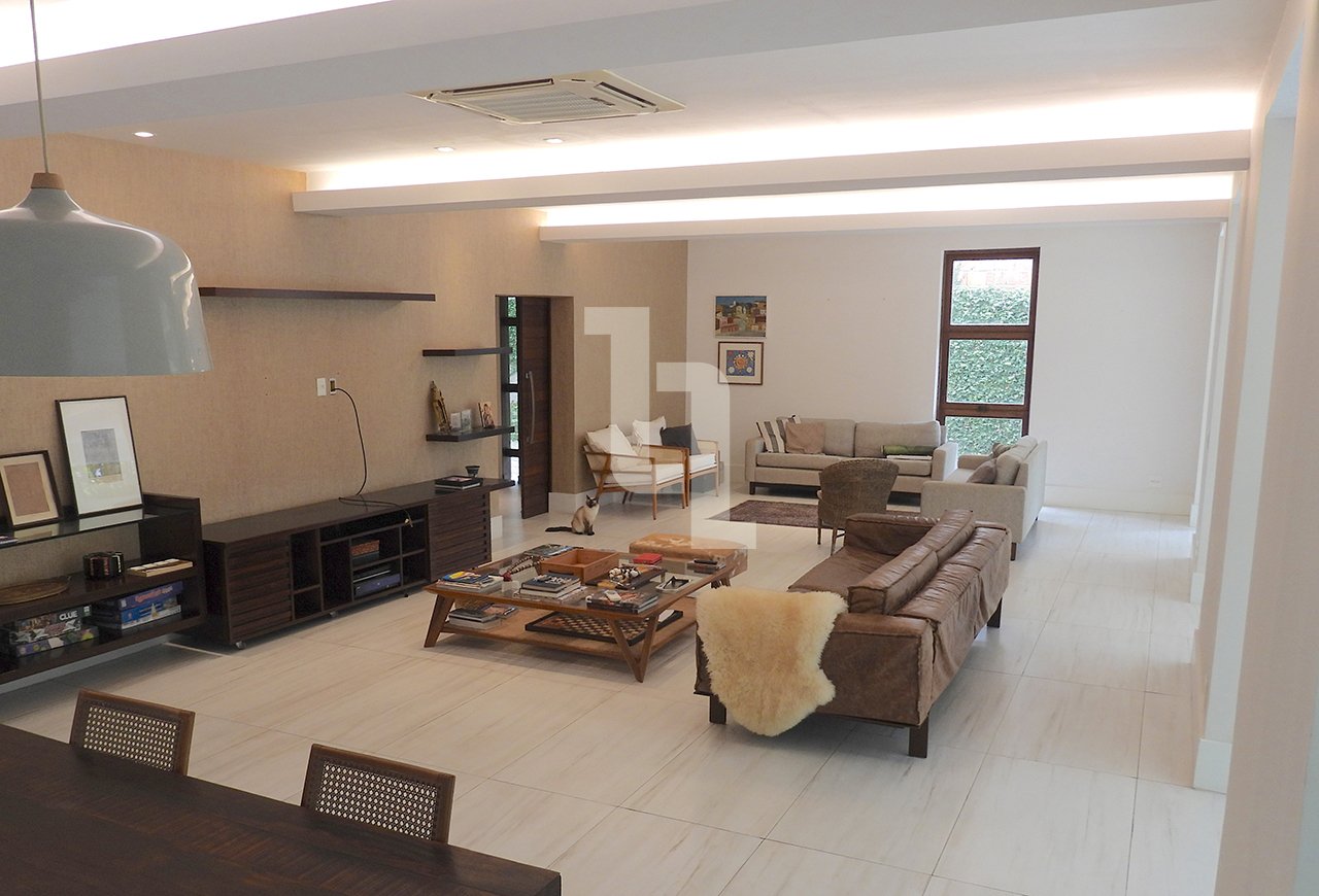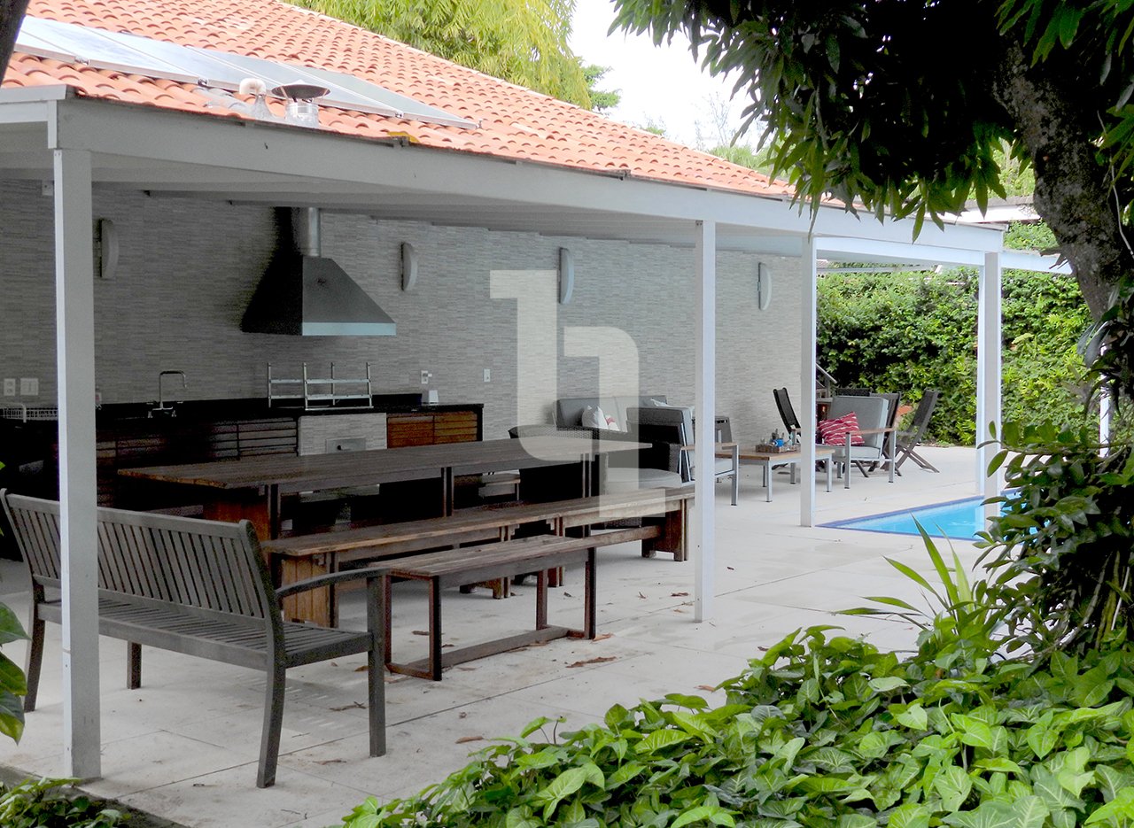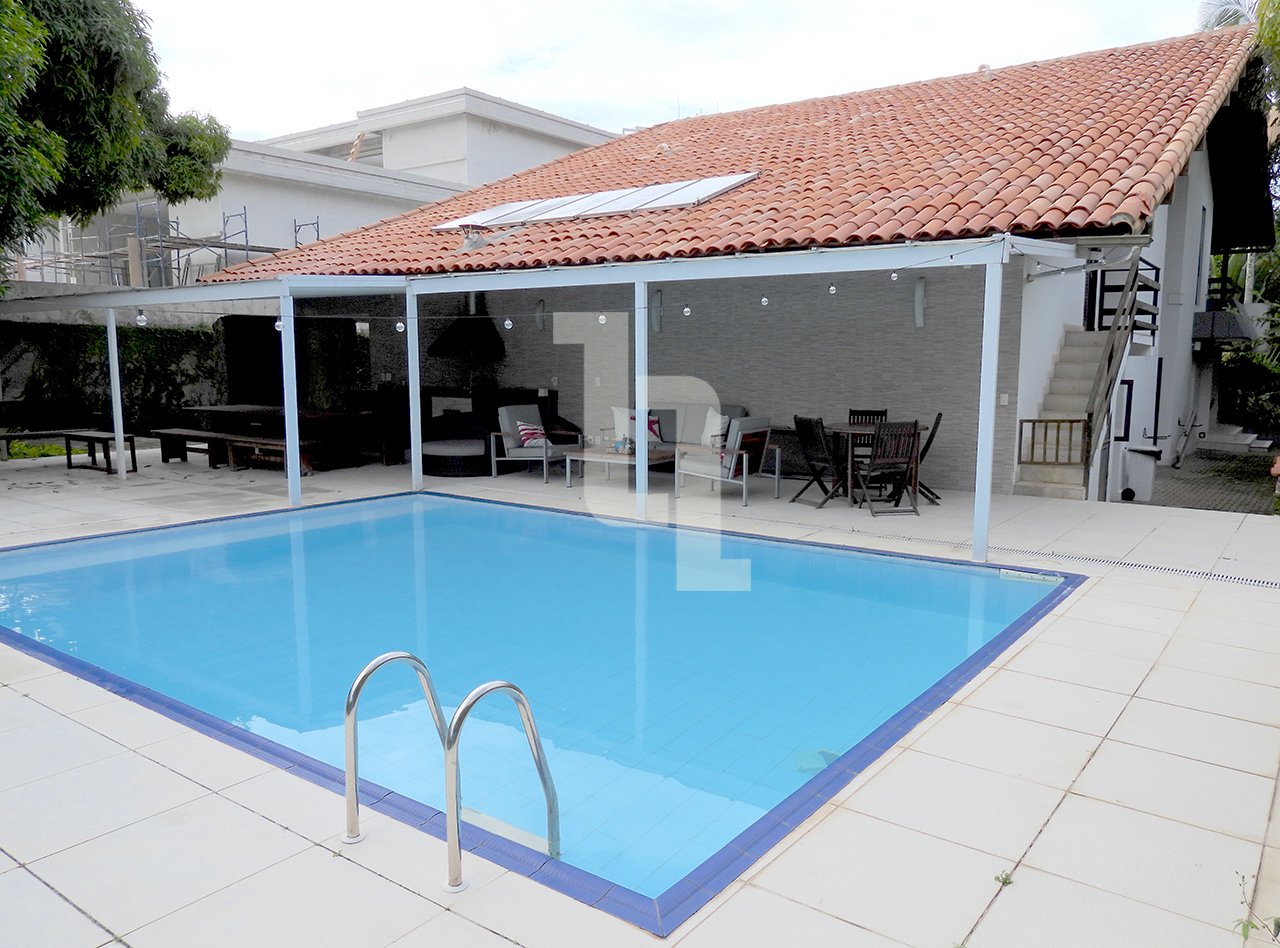 Na área externa há uma piscina de 30 m2, garagem para até 04 carros, churrasqueira com área gourmet e jardim arborizado. O térreo é composto por uma ampla sala de estar com sistema de ar-condicionado central, uma ampla cozinha planejada com ilha central e 02 dispensas, escritório, lavabo e varanda coberta.