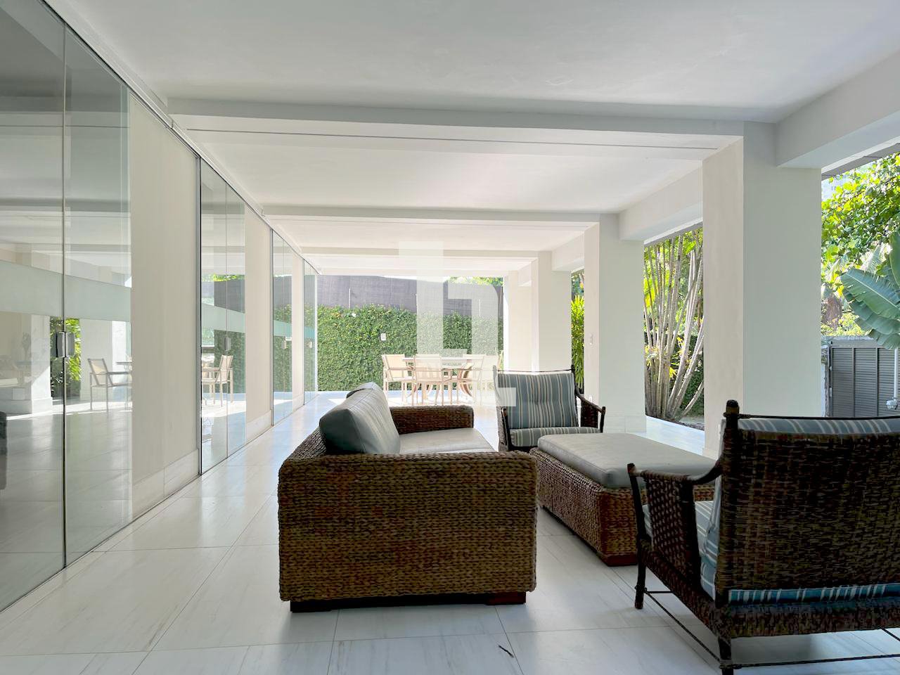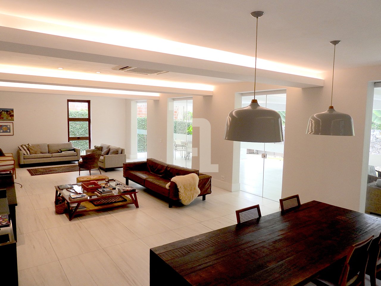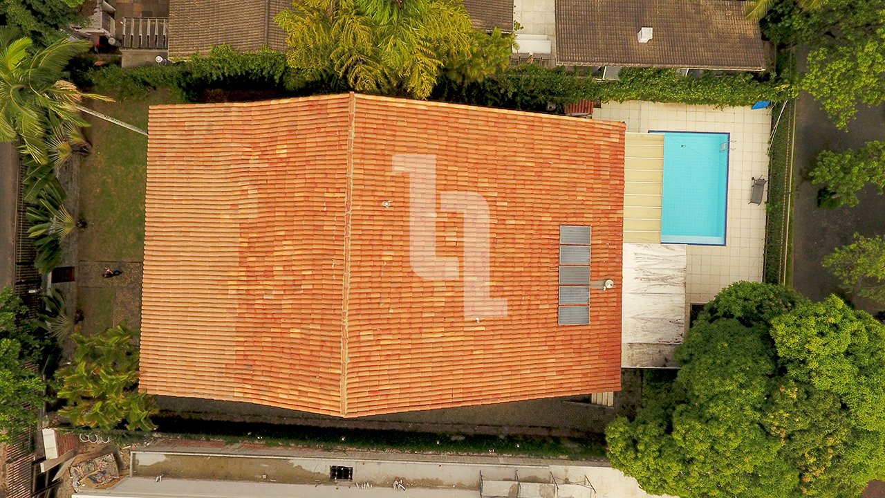 Na área externa há uma piscina de 30 m2, garagem para até 04 carros, churrasqueira com área gourmet e jardim arborizado. O térreo é composto por uma ampla sala de estar com sistema de ar-condicionado central, uma ampla cozinha planejada com ilha central e 02 dispensas, escritório, lavabo e varanda coberta.